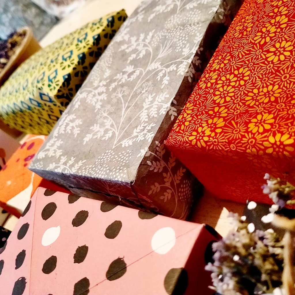 Scatoline realizzate con carte provenienti da vari luoghi, conservate nel tempo e create una ad una, piegandole pazientemente. Un esercizio per il corpo , la mente e lo spirito. Apprezzate da tutti, specialmente dai bambini, che adorano realizzarle e provano un’allegra soddisfazione a misurarle e chiuderle col loro coperchio. Geometria creativa!